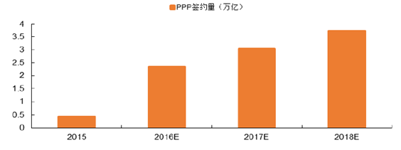 当前处在执行阶段的项目约占总项目的7.88%,金额约为7800亿元,剩下的9.1万亿元PPP项目还处于识别、准备、采购阶段,我们预计它们将在三年内陆续签约执行,预计2016/17/18年分别落地2.34/3.04(YoY30%)/3.74(YoY23%)万亿元。这些PPP项目在订单量上将构成今年及未来两年基建公司订单增长的持续增量。