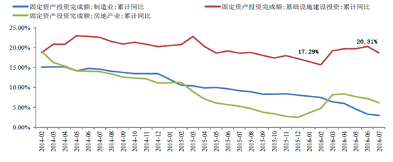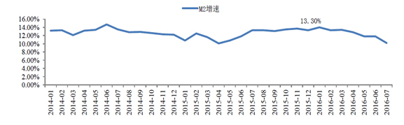 2015年,总的宏观基调是“宽货币,紧财政”,这里的依据是M2增速维持同比13.3%,基建增速下滑4%至17%。自去年年底中央工作会议以后,宏观基调变为稳增长,而“宽货币、紧财政”逐步切换为“稳货币、宽财政”,这一点从数据上得到了印证:上半年M2的增速开始回落企稳在10%一线,基建投资增速则上升至20%的增速。