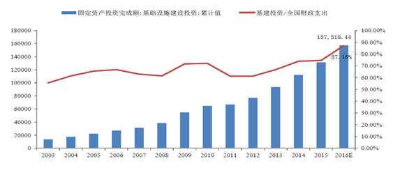 2003-2016年中国基建投资总额与全国财政支出比例关系(亿元、%)