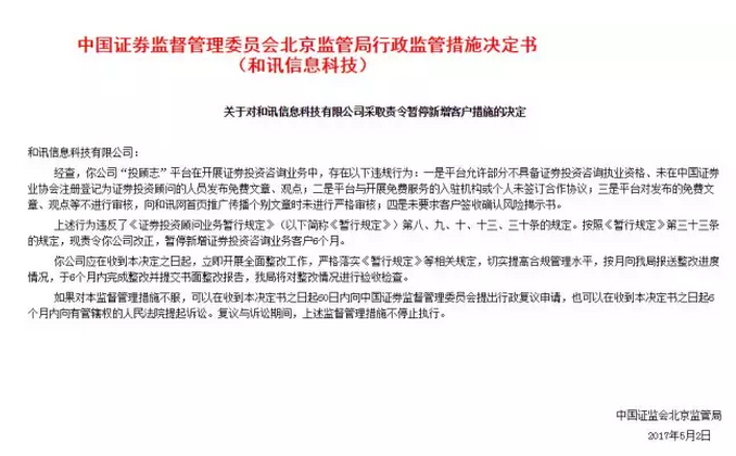 北京证监局公布《关于对和讯信息科技有限公司采取责令暂停新增客户措施的决定》。文件显示,和讯信息“投顾志”平台在开展证券投资咨询业务中,存在以下违规行为:一是平台允许部分不具备证券投资咨询执业资格、未在中国证券业协会注册登记为证券投资顾问的人员发布免费文章、观点;二是平台与开展免费服务的入驻机构或个人未签订合作协议;三是平台对发布的免费文章、观点等不进行审核,向和讯网首页推广传播个别文章时未进行严格审核;四是未要求客户签收确认风险揭示书。