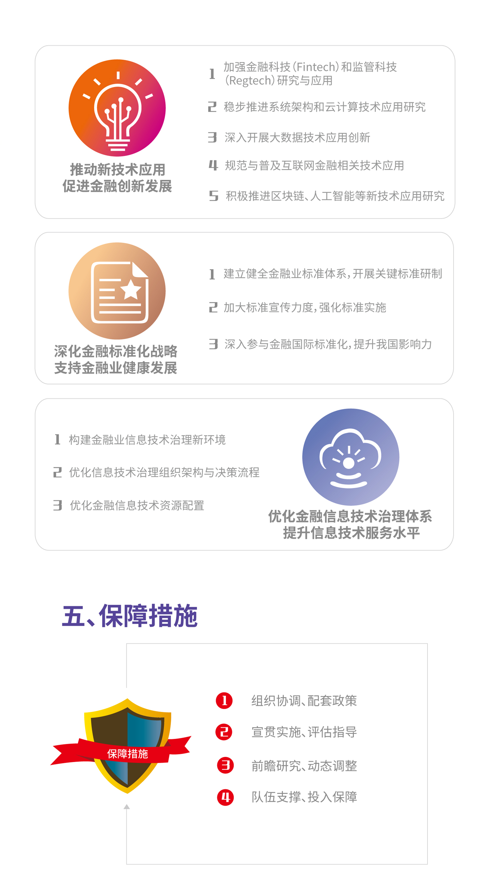 《规划》从“组织协调、配套政策,宣贯实施、评估指导,前瞻研究、动态调整,队伍支撑、投入保障”等方面提出了保障规划实施的措施,以推动金融业信息技术发展规划的有效实施。