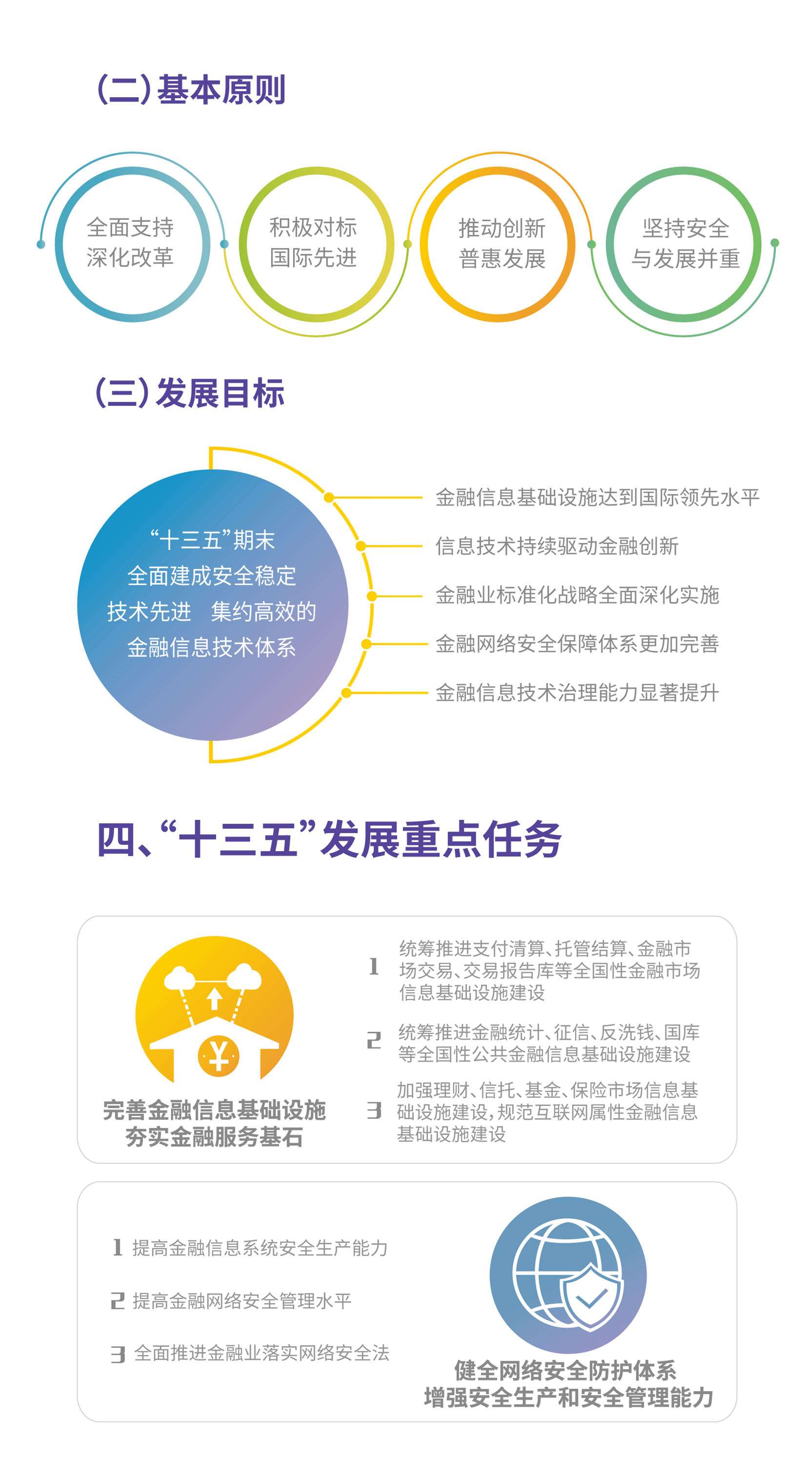 《规划》确立了“十三五”期间金融业信息技术工作的发展目标,主要包括:金融信息基础设施达到国际领先水平、信息技术持续驱动金融创新、金融业标准化战略全面深化实施、金融网络安全保障体系更加完善、金融信息技术治理能力显著提升。