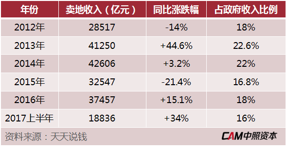 由此可见,卖地收入对于地方财政来说是非常重要的,甚至是生死攸关的。下面是过去几年的卖地收入情况。2015年的卖地收入大跌(见下图),直接导致中央出台“楼市去库存”政策,并引发了“房地产政策牛市”。事实上,卖地收入、与房地产有直接关系的税费,已经占到了财政总收入的30%以上。