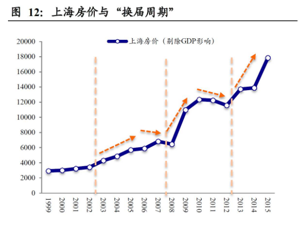 第二,各地楼市在“换届周期”前半段表现一般较好。各地房价变化与地方政府换届之间存在比较明显的联系。我们将各省房价对GDP和“政治周期”变量进行回归分析,剔除掉GDP因素对房价的影响后,可以发现:新一届地方政府主政前三年中,房价多数会实现上涨;而在主政的最后一年,房价涨幅会趋缓甚至下跌。下图以北京、上海为例,展示了这一规律。