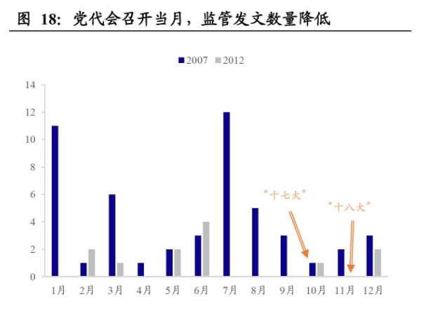 “换届周期”与政策“择时”。理论上监管层在选择政策推进时间点的过程中,也会考虑到自身的“考核周期”问题,也就是说,政策节奏在一定程度上也会受到“换届周期”的影响。我们以发文数量来度量“政策强度”,可以发现以下几个比较明显的规律:①从年度看,在每届中央领导人第一轮任期和第二轮任期起承(前后三年)的时间段里,政策强度会达到高峰。②从月度看,在党代会召开月份前后,似乎的确会出现发文数量减少的情况。