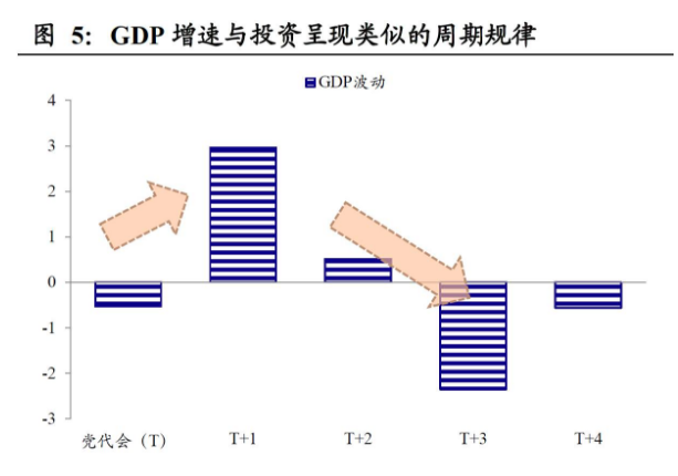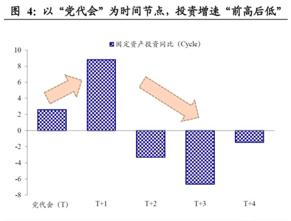 党代会后第一年,投资一般会出现“井喷”。为了更严谨地进行验证,我们将固定资产投资增速拆分为“趋势项”和“波动项”(H-P Filter),去除“趋势”因素后,考察其中“波动项”的变化规律,可以发现投资增速在一个完整的5年“换届周期”(以党代会为时间节点划分)中呈现明显的“前高后低”特征,即投资增速在党代会当年开始回暖,会后第一年会大幅上升,随后进入相对低谷。