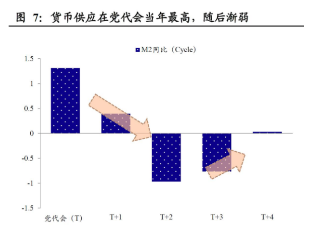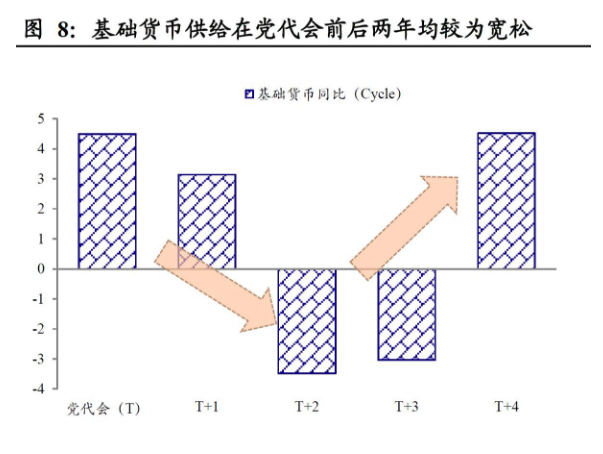 货币环境的“换届周期”。我们观察到,在5年“换届周期”中呈现“前松后紧”的特征,党代会当年,货币供应量和基础货币供给均处于较高水平,换届后第一年货币环境仍然偏宽松,但随后两年会出现明显的边际收紧。与通胀类似,通过计量统计得出的货币环境“换届周期”似乎与近几年的货币政策背离,可能的原因在于08年后全球央行“大放水”与商品大熊市并存,通胀低迷的背景下,传统的货币周期不再明显。