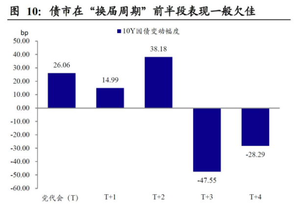 第一,债市在“换届周期”前半段表现一般欠佳。如前所述,党代会人事落地后政府投资意愿会出现显著上行,带动经济走向阶段性“过热”,从而在一段时间内压制债市的表现。除了2008年国际金融危机外部冲击过大,扰乱了该节奏外,党代会后的2年内债市表现一般比较低迷。