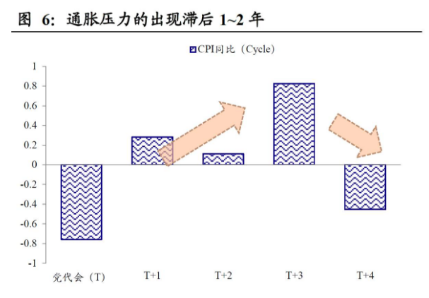 增长与通胀的“换届周期”。资本形成在中国经济增长中贡献了近一半的力量,因此投资行为伴随“政治因素”的周期性变化也带动了整个经济在“政治周期”中相应起落。我们用与前文所述相同的方法处理增长和通胀指标,可以看到:①整个经济(GDP)增长速度与投资类似,在党代会后的第一年达到波峰,而在会后第3年陷入波谷。②通胀的变化滞后于实际增长的变化,在党代会当年,一般通胀压力最为温和,随后开始逐渐抬头,并在会后第3年达到峰值,不过这与我们感受到的真实通胀情况有一定出入,显示通胀的“换届周期”并没有那么明显。