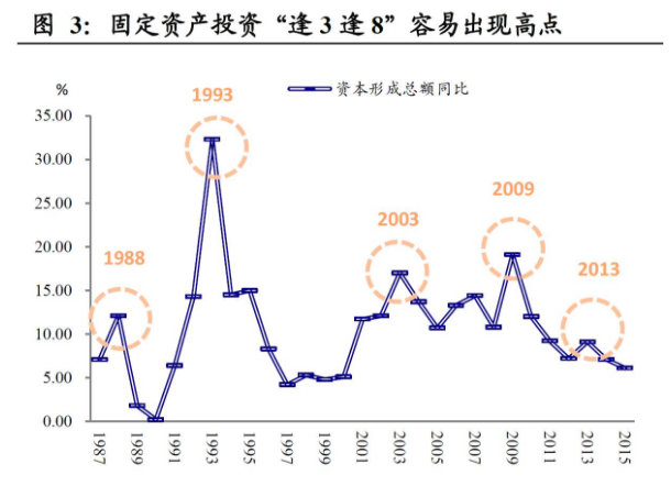 固定资产投资的“三八现象”。三大需求之中,固定资产投资最直接地受到政府行为扰动,如果观察投资的变化,可以发现一个有趣的“三八现象”,即投资高峰几乎全部出现在尾数是“3”或“8”的年份(2008年受国际金融危机影响,推后至2009年)。这种现象的出现并不是“巧合”,很大程度上就是“政治周期”作用的结果。前文提到过,1977年以来党代会“逢2逢7”召开,也就是说,“投资井喷”几乎全部出现在党代会后的第一年。