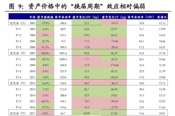 资产价格中的“换届周期”效应相对偏弱。尽管“政治周期”对经济增长的影响非常明显,但进一步传导到资产价格层面,由于后者影响因素众多,时常与基本面步调相左,规律性已经被大大削弱了。例如,党代会后第一年一般经济表现会比较好,但股市多数时候却是下跌的;即使是考察股债的相对比价,在党代会后的第一年也往往是边际回落的。
