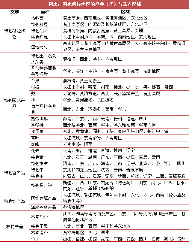 我国特色农产品种类多、产业发展不均衡、市场需求差异大。为突出国家级特优区的辐射带动作用,统筹考虑农业资源禀赋、环境承载力、产业基础及发展潜力等,按照既要强调“特色”、更要突出“优势”的原则,聚焦发展五大类特色农产品中的29个重点品种(类)。其中,对生产规模比较大、区域分布广、带动农户多的,选择具体品种创建,包括马铃薯、苹果、茶叶等;对单个品种产业规模小、产品功能相似、适生区域相近的,按多个品种归类创建,包括特色粮豆、道地药材、食用菌等;由于特殊的生产销售模式,难以细分品种的,按照生产销售模式创建,包括特色出口蔬菜及瓜类、季节性调运大宗蔬菜及瓜类等(全国特优区创建重点品种及区域见附表)。省级特优区不局限于这29个品种(类),可根据本地实际,自行选择创建品种,确定创建区域。